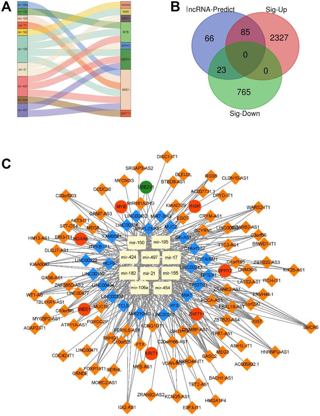 In the following step, we showed the relation between the 8 target genes and their corresponding miRNAs. We found that miR-106a, miR-150, miR-155, miR-17, miR-182, miR-195, miR-21, miR-424, miR-454 and miR-497 could target the 8 mRNAs respectively. For example, miR-195 targeted INSR, MYB, WEE1 and UBE2V1, while miR-106a, miR-155, miR-17, miR-195, miR-424 and miR-497 regulated WEE1 (Figure 5A). Since TCGA and GTEx also provided the data of lncRNAs, the differentially expressed lncRNAs were also analyzed by edgeR. 2412 up-regulated lncRNAs and 788 down-regulated lncRNAs were identified. Then these 3200 lncRNAs were overlapped with the lncRNAs (174) predicted from 10 miRNAs, and we got 108 different expressed 108 lncRNAs (Figure 5B). At last, a lncRNA-miRNA-mRNA ceRNA network was constructed by 108 lncRNAs, 10 miRNAs and 8 mRNAs, as shown in Figure 5C.