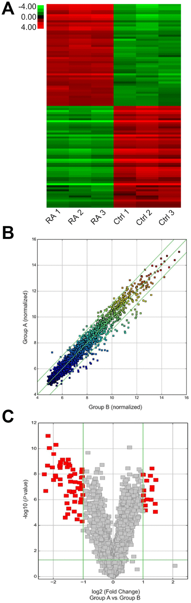 Subjects were selected from the patients that were admitted to Clinical Medical College, Yangzhou University, for the first time. Eligible subjects conformed to the diagnostic criteria of RA, did not show any complications, and had not previously been treated with immunosuppressants. We also recruited 8 healthy volunteers to serve as the control group (male = 4, female = 4). We collected the samples of cartilage tissues from 26 RA patients and 8 healthy volunteers.