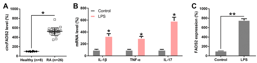 To confirm and uncover the role of circFADS2 in chondrocytes after LPS treatment, we first confirmed the difference in circFADS2 expression in RA patients and LPS-treated chondrocytes vs. the control groups by qPCR analysis. CircFADS2 expression was significantly upregulated in the samples of the 26 RA patients when compared to the healthy control (Figure 2A). To confirm the effect of LPS treatment on RA cell model, we firstly examined the expression of these three cytokines (IL-1β, TNF-α, and IL-17), qPCR data indicated that IL-1β, TNF-a, and IL-17 were upregulated (Figure 2B), indicating that these cytokines, especially IL-1β and TNF-α (two key RA model inducers), may also be participated in this regulation. LPS-treated chondrocytes exhibited increased circFADS2 levels when compared to untreated chondrocytes (Figure 2C), revealing that circFADS2 plays a critical role in LPS-response in the chondrocytes.
