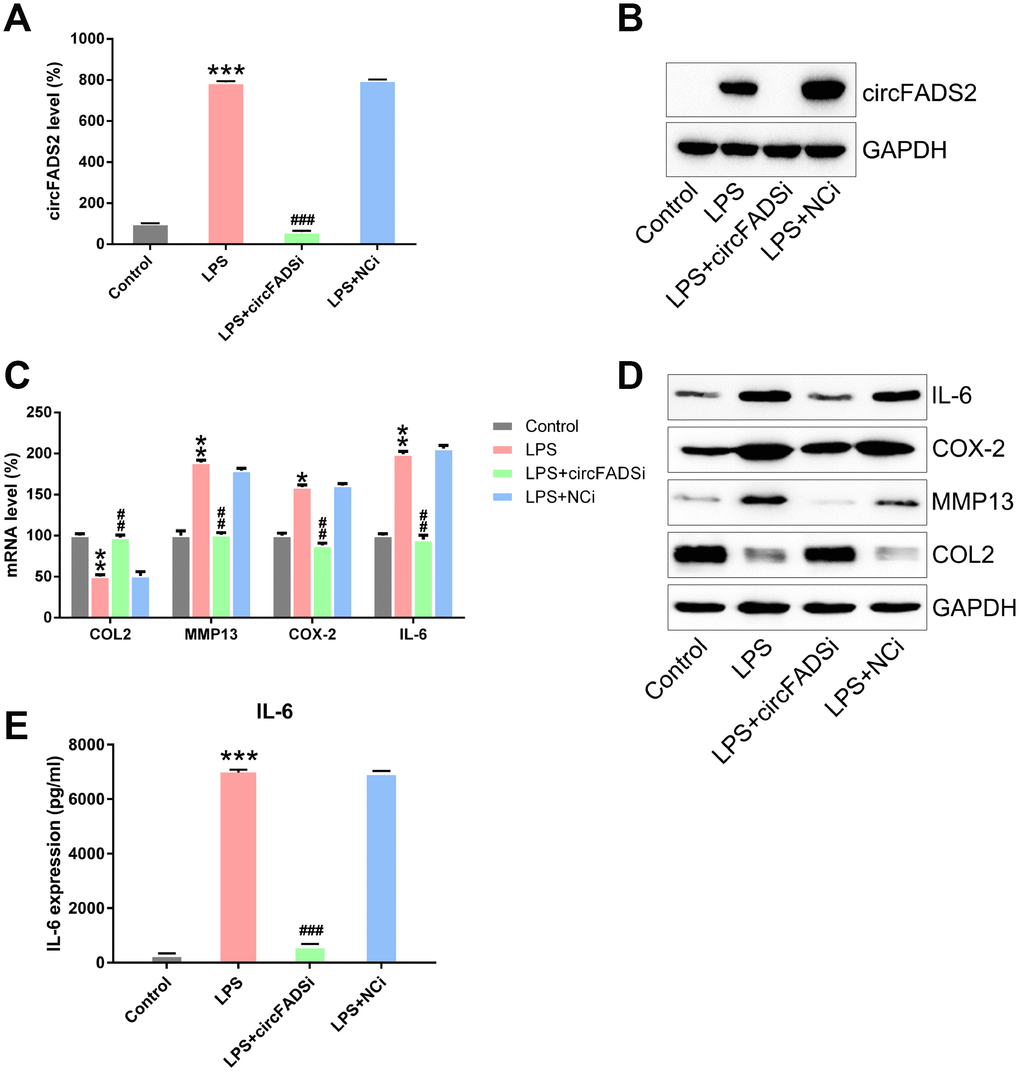 To reveal how circFADS2 affects ECM catabolism and inflammation in chondrocytes after LPS treatment, we transfected the cells with a siRNAs against circFADS2 (si-circFADS2) to suppress circFADS2 expression and explored the downstream effects of this down-regulation on LPS-treated chondrocytes. qPCR and northern blot results confirmed that circFADS2 was remarkably down-regulated after si-circFADS2 transfection when compared to the NC group (Figure 3A, 3B). ELISA, qPCR and WB analyses showed that circFADS2 knockdown produced higher levels of type II collagen (COL2) when compared to the WT group and down-regulated MMP13, COX-2, and IL-6 at the RNA and protein level in LPS-treated chondrocytes (Figure 3C–3E). Thus, circFADS2 knockdown protects the chondrocytes against ECM degradation and massive release of inflammatory cytokines after LPS-treatment.