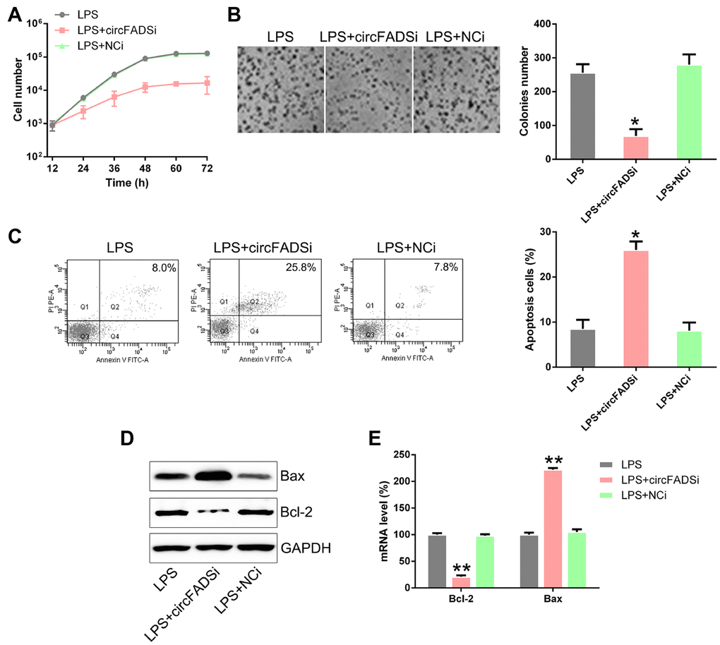 To explore whether circFADS2 regulated the proliferation and apoptosis of the chondrocytes after LPS treatment, we inhibited circFADS2 expression (Figure 3A) and measured the changes in cell viability and proliferation by the CCK-8 and colony formation assays. The results showed that after circFADS2 suppression, cell viability and proliferation were reduced when compared to the WT and NC groups (Figure 4A, 4B). We measured the apoptotic levels of LPS-induced chondrocytes with or without circFADS2 silencing and found that circFADS2 depletion resulted in increased apoptotic levels (Figure 4C). When compared to the WT group, the circFADS2-silenced group showed a decrease in Bcl-2, but an increase in Bax at the protein and mRNA levels (Figure 4D, 4E). In conclusion, circFADS2 protects chondrocytes against apoptosis and production of apoptotic factors.