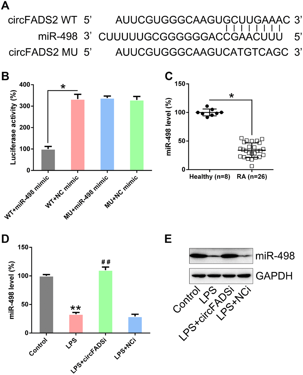 A previous study indicated that miR-498 is targeted by circFADS2 during lung cancer [18]. Thus, we hypothesized that circFADS2 could also target miR-498 and modulate its downstream functions in LPS-treated chondrocytes. Our hypothesis was supported by bioinformatic analyses (Figure 5A). The direct relationship between miR-498 and circFADS2 was investigated using the DLRA (Figure 5B). The function of luciferase was inhibited by 70 % in cells transfected with miR-498 mimic fused to the WT circFADS2 when compared to that of cells from the control groups. We further evaluated miR-498 expression in samples from RA patients and healthy controls. As shown in Figure 5C, the RA group expressed significantly less miR-498 than the healthy group. Additionally, miR-498 levels in LPS-treated chondrocytes were reduced when compared to those in non-treated cells using qPCR and Northern blotting detection (Figure 5D, 5E). Cells transfected with si-circFADS2 had significantly higher miR-498 levels.