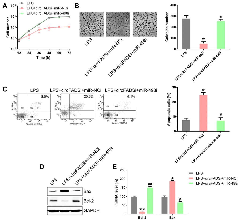 To evaluate the effect of miR-498 inhibition on cell proliferation and apoptosis, CCK-8 and colony generation assays were performed on the circFADS2i+miR-498i group, showing that miR-498 inhibitors caused a reduction in cell proliferation, similar to si-circFADS2 (Figure 7A, 7B). Moreover, flow cytometry showed that miR-498 inhibitors decreased the stimulatory effects of circFADS2i on apoptosis (Figure 7C). Additionally, WB analysis confirmed that transfection with miR-498 inhibitors reversed the expression levels of circFADS2i-regulated apoptotic factors (Bcl-2 and Bax) (Figure 7D, 7E). These data suggested that circFADS2 influences the properties of LPS-induced chondrocytes by regulating miR-498.