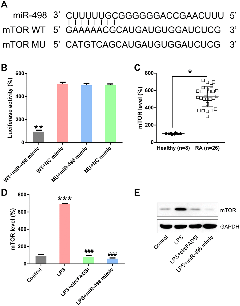 A predictive analysis revealed a possible binding site of miR-498 on the 3′-UTR of mTOR (Figure 8A), while DLRA showed that miR-498 mimic transfection reverses the decrease in luciferase activity through WT mTOR (Figure 8B), suggesting that miR-498 may target mTOR. mTOR was also remarkably up-regulated in RA patients when compared to the healthy group (Figure 8C). To further confirm the relationship between circFADS2, miR-498, and mTOR expression, circFADS2 was silenced, or miR-498 expression was upregulated in LPS-induced chondrocytes. We found that both circFADS2 silencing and miR-498 upregulation caused a significant reduction of mTOR expression at the protein and mRNA levels (Figure 8D, 8E).