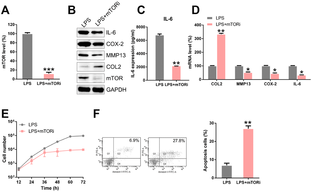 To elucidate the role of mTOR in the processes of LPS-induced chondrocytes, such as ECM disorder, inflammation, and apoptosis, we performed the experiment mentioned above in LPS-induced chondrocytes with a mTOR knockdown. qPCR and WB analysis confirmed that mTOR was downregulated in the transfected cells (Figure 9A, 9B). The results showed that mTOR silencing increased the expression of COL-2 and reduced the levels of MMP13, COX-2, and IL-6 (Figure 9B–9D). Additionally, mTOR inhibition decreased the proliferation of LPS-induced chondrocytes (Figure 9E) and increased the apoptotic levels in LPS-treated chondrocytes (Figure 9F). These data suggested that circFADS2 and miR-498 may exert their functions via mTOR.