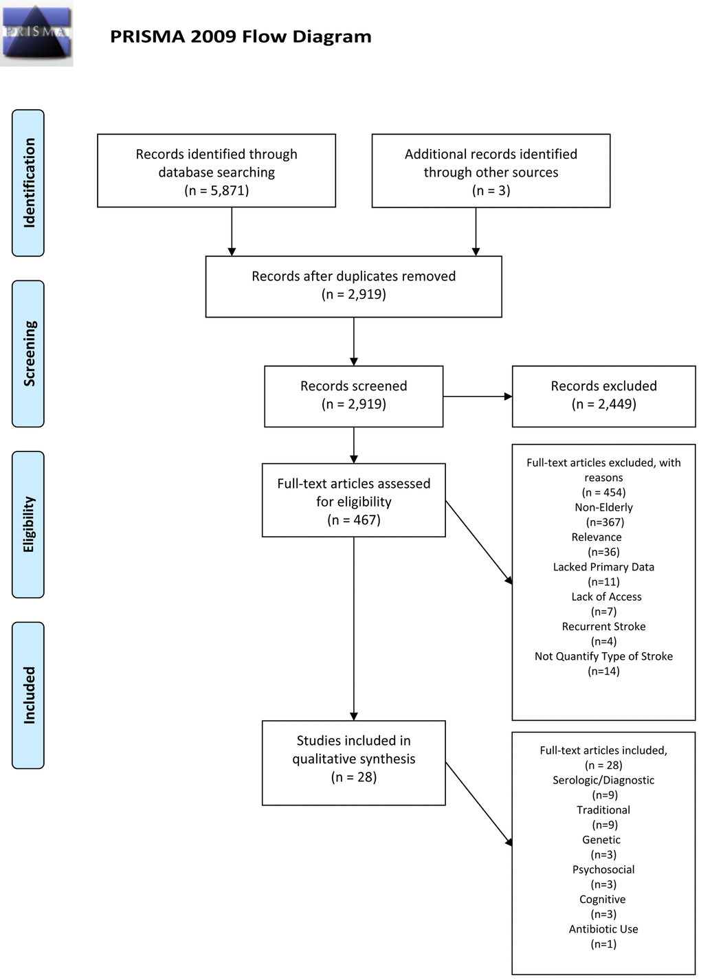 The initial search yielded 5,871 peer-reviewed publications, and 2,919 were reviewed after all duplicates were eliminated. All publication titles and abstracts were reviewed, which resulted in 467 full articles that fit criteria. Three additional articles were added based on citations from other papers. After reading the full articles, 425 articles were excluded based on our established exclusion criteria. Excluded were: 367 articles that did not focus on the elderly (<65 years), 47 that lacked primary data to address our study aim, 7 that were abstracts from conference presentations, 4 that focused on risk factors for recurrent stroke and 14 that did not ascertain type of stroke (i.e., ischemic; hemorrhagic). Thus, 28 papers published between 1992 and 2015, met our criteria and were included in our review (Figure 1, PRISMA). We extracted results from the 28 papers and categorized the articles into six areas: serologic/diagnostic risk factors (9 studies; see Table 1), conventional risk factors (9 studies; see Table 2), genetic risk factors (3 studies; see Table 3), psychosocial risk factors (3 studies; see Table 4), cognitive risk factors (3 studies; see Table 5), and antibiotics risk factors (1 study; see Table 5).