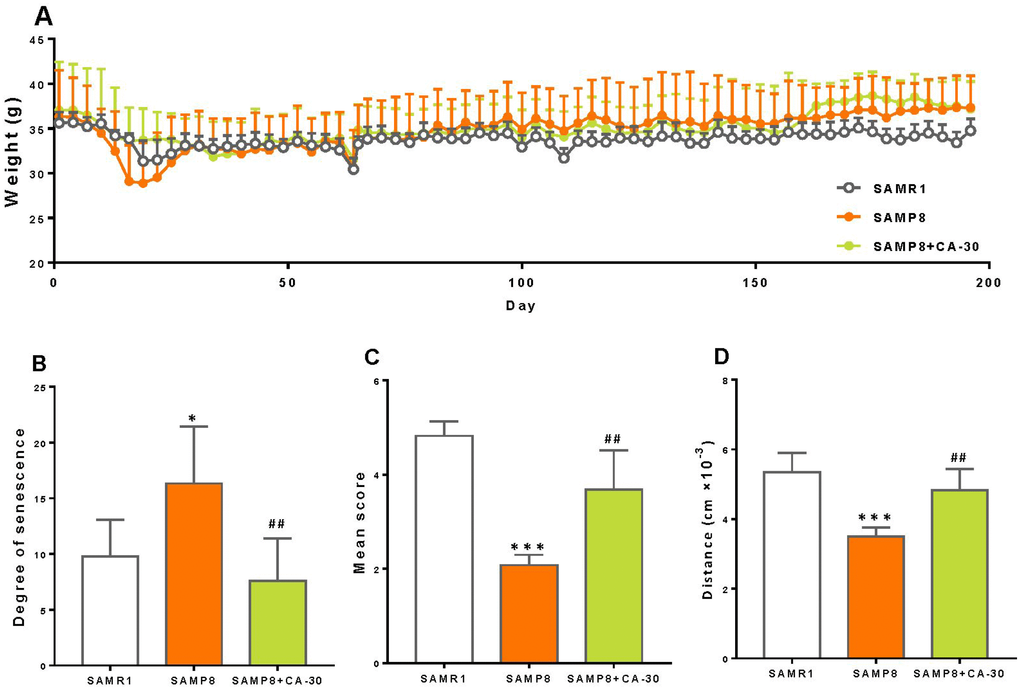 SAMP8 mice are a model of accelerated senescence. Our results demonstrate that the body weight of SAMP8 mice did not differ significantly from SAMR1 or CA-30 treated animals (Figure 1A). SAMP8 mice exhibited a greater degree of senescence than did SAMR1 mice (Figure 1B) but lower mean nest building and total spontaneous locomotor activity than SAMR1 mice (Figure 1C and 1D). After being treated with CA-30, senescence in SAMP8 mice significantly decreased and their nest building and locomotor activity increased. This indicates that treatment with CA-30 delays aging processes in SAMP8 mice.