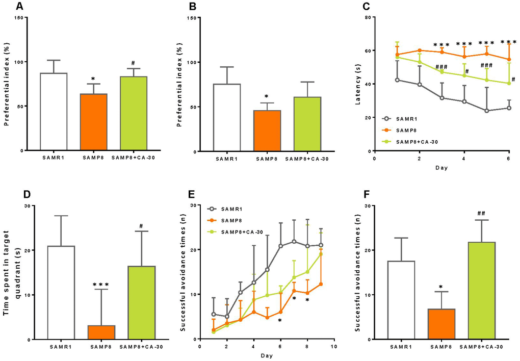 Finally, the shuttle-box test was used to evaluate active avoidance in mice in the present study. Successful avoidance times in SAMP8 group were significantly decreased beyond SAMR1 group levels beginning on the sixth day of training (Figure 2E). Successful testing phase avoidance times in the SAMP8 group also decreased as compared to the SAMR1 group. These avoidance times increased, however, after the CA-30 administration (Figure 2F). This indicates that CA-30 ameliorates active avoidance deficits in SAMP8 mice.
