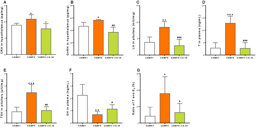 To investigate neuroendocrine system functioning in SAMP8 mice and any potential influence of the CA-30, the concentrations of CRH, GnRH, and TRH in the hypothalamus; ACTH, FSH, LH, TSH, and GH in the pituitary; and corticosterone, T, E2, T3, and T4 in the plasma were measured by radioimmunoassay. We found that the concentration of CRH (a central player in the HPA axis) was significantly increased in the SAMP8 group as compared to the SAMR1 group and significantly decreased with CA-30 administration (Figure 3A). Within the HPG axis, the concentrations of GnRH, LH, and T were an increased in the SAMP8 group and declined significantly with CA-30 administration (Figure 3B–3D). Within the HPT axis, the level of TSH increased in the SAMP8 group, while CA-30 significantly decreased TSH levels (Figure 3E). In addition, the concentration of GH in the plasma was significantly lower in the SAMP8 group than in the SAMR1 group and was increased by CA-30 administration (Figure 3F). The concentrations of ACTH and corticosterone in the HPA axis; FSH and E2 in the HPG axis; and TRH, T3, and T4 in the HPT axis were not significantly different between the SAMP8 and SAMR1 groups (data not shown). Nevertheless, decreases in the ratio of T to E2 in the plasma were observed in the SAMP8 group compared to the SAMR1 group. CA-30 treatment significantly restored this ratio to control levels (Figure 3G). These data indicate that CA-30 ameliorated multiple neuroendocrine system phenotypes in SAMP8 mice.