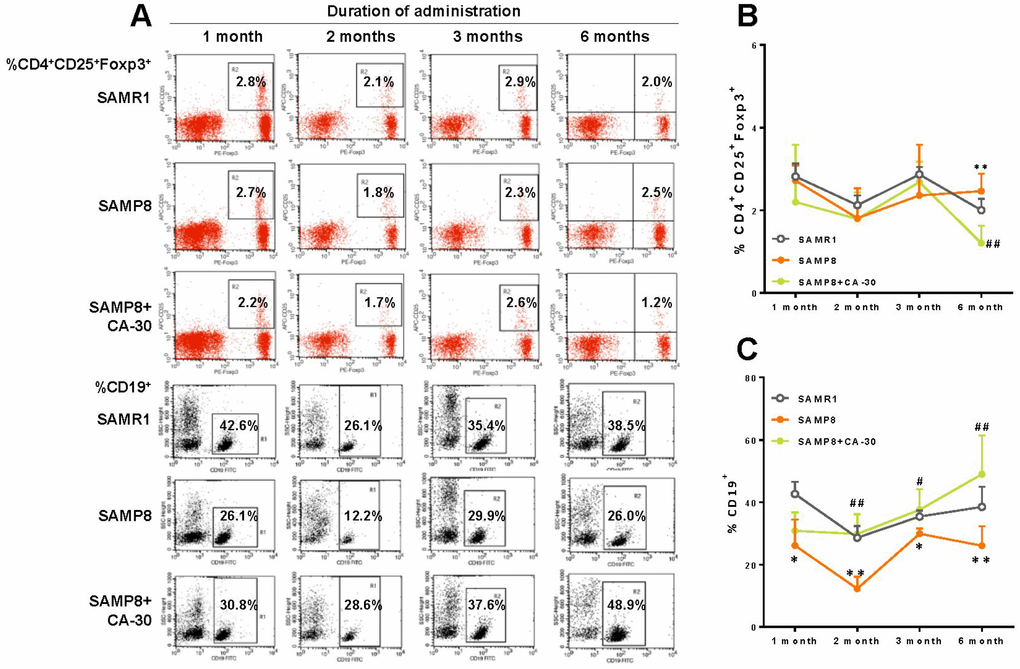 To investigate the effects of CA-30 on lymphocyte subsets in SAMP8 mice, the dynamic expression of CD3+ T cells, CD3+CD4+ T cells, CD3+ CD8+ T cells, CD8+ CD28+ T cells, CD4+ CD25+Foxp3+T cells, and CD19+ B cells one, two, three, and six months after CA-30 administration were assessed by flow cytometry. The expression of CD4+CD25+Foxp3+T (Treg) cells in the SAMP8 group was significantly increased over SAMR1 group levels in year-old mice (six months after CA-30 administration) (Figure 4B). The expression of CD19+ B cells in the SAMP8 group was significantly decreased in the SAMR1 group in seven-month-old mice (one month after administration CA-30) (Figure 4C). Expression of the other lymphocyte subsets in SAMP8 mice (data not shown) was not significantly changed by CA-30. In the SAMP8 group, the expression of Treg cells decreased after six months of CA-30 treatment (Figure 4B), while the expression of CD19+ B cells increased after two months of CA-30 treatment (Figure 4C). These results indicate that CA-30 treatment partially restored normal lymphocyte expression in SAMP8 mice.
