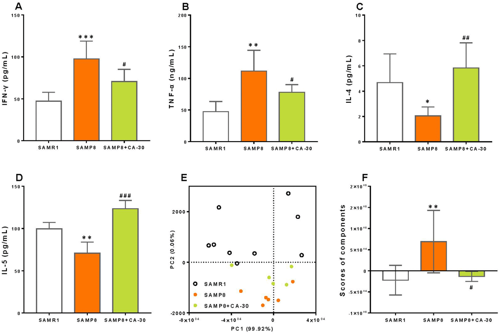 CA-30 treatment significantly decreased the production of IFN-γ and TNF-α and increased levels of IL-4 and IL-5 in the present study. To determine the effects of CA-30 on abnormal cytokine secretion in SAMP8 mice, principal component analysis (PCA) was performed here. PCA utilized data about the secretion of 17 cytokines in the SAMR1, SAMP8, and CA-30-treated groups and revealed that principal components 1 (PC1) and 2 (PC2) grouped mice from the three different groups into three distinct clusters (Figure 5E). Mice in the SAMR1 group were localized to the top of the resultant PCA graph, most of the mice in the SAMP8 group were localized to the bottom, and mice in the CA-30 group were localized between the SAMR1 and SAMP8 groups. To further analyze the effects of CA-30 on cytokine secretion, average PCA scores were graphically depicted (Figure 5F). This depiction revealed that the average cytokine score of the SAMP8 group was significantly higher than that of the SAMR1 group, and administration of CA-30 decreased this score. These results indicate that cytokine secretion in SAMP8 mice was abnormal and that administration of CA-30 restored this aberrant immune phenotype inSAMP8 mice.