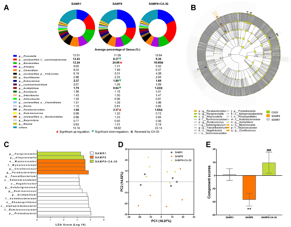 Linear discriminant analysis effect size (LEfSe) testing was used to further assess alterations in microbiota composition with CA-30 treatment. The structure and predominant microbiota in each group were also represented as a cladogram (Figure 6B). The greatest differences in taxa from the phylum to the genus level was identified by linear discriminant analysis (LDA) scoring (Figure 6C). Most specific taxa in the SAMP8 group were mainly from the Proteobacteria phyla (75% on average). The SAMR1 group contained two dominant phyla: Firmicutes (45.5% on average) and Proteobacteria phyla (36.4% on average). The CA-30 group contained only taxa from the Bacteroidetes phyla. Weighted UniFrac-based PCA revealed distinct clusters of microbiota in the CA-30-treated groups (Figure 6D). Average PCA scores revealed that the average gut microbiota score of the SAMP8 group was significantly lower than that of the SAMR1 group, while administration of CA-30 increased this score (Figure 6E). These results suggested that CA-30 facilitates advantageous changes in the structure of the gut microbial community.