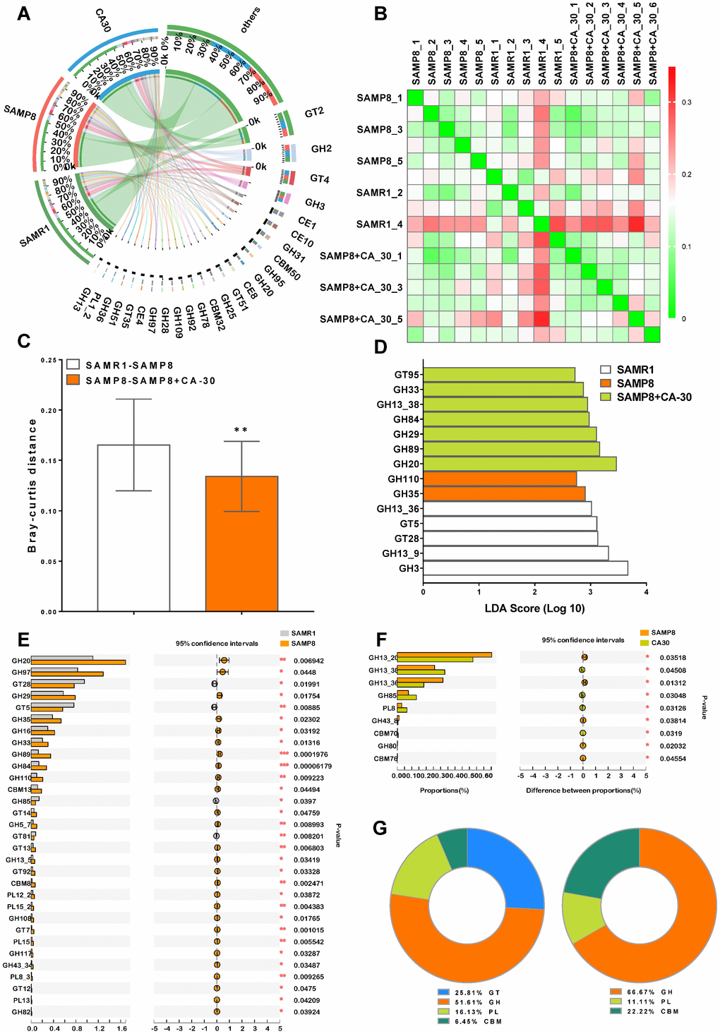 Hierarchical clustering analyses of enriched CAZy families were represented as a heat map (Figure 7B). We observed significant Bray-Curtis distance differences between the SAMR1 and SAMP8 groups and the SAMP8 and CA-30 groups on the basis of CAZy family profiles (Figure 7C). The greatest CAZy family difference in each group was identified in the GH family via LDA scores (Figure 7D). When compared to the SAMR1 group, there were 27 significantly increased and four decreased CAZy families in the SAMP8 group (Figure 7E). When SAMP8 mice were treated with CA-30, nine CAZy families were significantly altered (four increased and five decreased) (Figure 7F). Among these, the percent of community abundance of GH85 in the SAMP8 group was lower than in the SAMR1 group, while the abundance of GH85 was reversed considerably by CA-30 treatment. Similar to our LEfSe analysis findings (Figure 7D), the most significantly changed CAZy families between groups were concentrated in the GH family (Figure 7G). Collectively, these data suggest that CA-30 treatment facilitated advantageous SAMR1-like changes in gut microbial function in SAMP8 mice and that this amelioration might be principally relevant to the modulation of GH family-related changes.