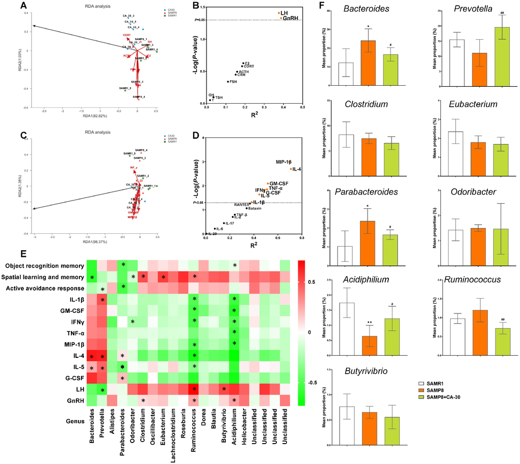 At the genus level, Prevotella, Lachnospiraceae, Bacteroides, Clostridium, Alistipes, Firmicutes, Oscillibacter, Eubacterium, Parabacteroides, Odoribacter, Lachnoclostridium, Roseburia, Acidiphilium, Clostridiales, Helicobacter, Ruminococcus, Bacteroidales, Dorea, Butyrivibrio, and Blautiawere were highly abundant (Figure 6A). Moreover, the percent of community abundance of Lachnospiraceae, Eubacterium, and Acidiphilium in the SAMP8 group was lower than in the SAMR1 group. CA-30 decreased the percents of Bacteroides, Acidiphilium, and Parabacteroides and increased the percents of Bacteroides and Parabacteroides (Figure 6A). There were only four genera unique to the SAMR1 and CA-30 treated mice, including Thermomonas, Paramesorhizobium, Alicycliphilus, and Candidatus_Midichloria. Four genera in SAMP8 mice were eliminated by CA-30 administration (Malonomonas, Nevskia, Candidatus_Megaira, and unclassified_f_Chromobacteriaceae). Ten newborn genera were present only in CA-30 treated mice, including Xylophilus, Serpens, Hathewaya, Tanticharoenia, Wigglesworthia, Kinetoplasti bacterium, Ventosimonas, Marinosulfonomonas, unclassified_c_Epsilonproteobacteria, and unclassified_o_Desulfovibrionales.