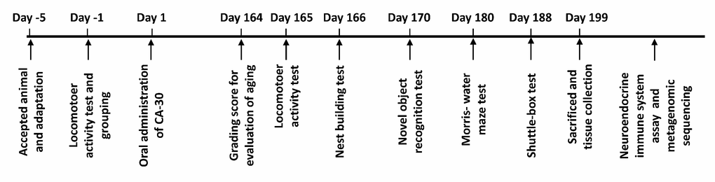 CA-30 was dissolved in distilled water at 122.4 mg/mL. The drug-treated mice group was given an intragastric administration of CA-30 (0.1 mL/10 g body weight) once daily for 199 days. SAMP8 mice were age-matched to SAMR1 mice (9 males) as a control group and administered an equal volume of deionized water. Mice were weighed every three days. Drug administration and behavioral tests were performed according to predetermined experimental timelines (Figure 9). After the behavioral experiments, mice were placed in a sealed chamber and euthanized via isoflurane inhalation followed by cervical dislocation. The whole brain, hippocampus, cortex, hypothalamus, pituitary, plasma, and stool from each mouse were collected for hormone determination, lymphocytes subset analyses, and cytokine and metagenomic analyses.