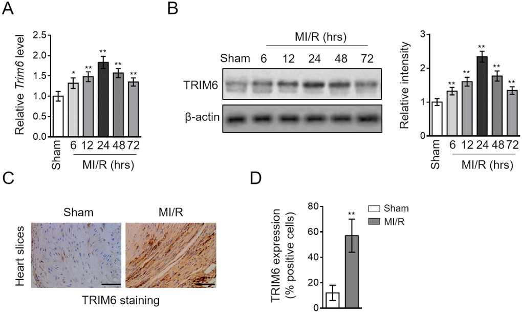 We initially sought the possible role of TRIM6 involved in MI/R injury by comparing its transcript level in the hearts of mice subjected to sham or experimental MI/R. As a result, qRT-PCR analysis showed that compared with sham group, the transcript level of Trim6 was increased in the heart after MI/R injury, which peaked at 24 hr and then declined thereafter (Figure 1A). Likewise, the protein level of TRIM6 displayed similar tendency of upregulation in the heart of MI/R group, as analyzed by Western blotting assay (Figure 1B). Moreover, the induction of TRIM6 expression was further confirmed by an enhanced staining of TRIM6 in MI/R hearts, as shown by immunohistochemistry analysis (Figure 1C–1D). Altogether, these results indicate that TRIM6 is upregulated at both mRNA and protein levels in the heart following MI/R injury.