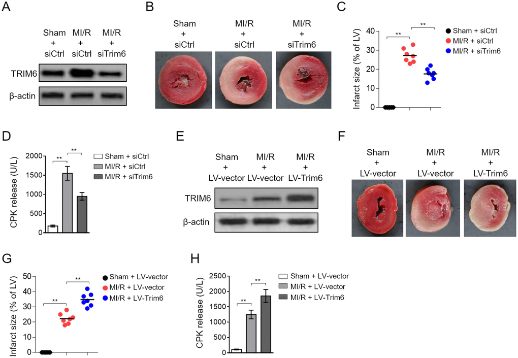 Since TRIM6 knockdown ameliorates MI/R injury, which suggests a detrimental role of TRIM6 in this condition. In order to directly demonstrate it, we overexpressed TRIM6 in the heart by lentiviral infection. Western blotting analysis showed that compared with vector control (LV-vector), lentivirus infection-mediated TRIM6 overexpression (LV-Trim6) resulted in stark increase in TRIM6 level in the heart (Figure 2E). The staining of myocardial tissues showed an exacerbated infarct size in TRIM6-overexpression heart after MI/R injury (Figure 2F). Additionally, the ratio of IS to LV was increased in LV-Trim6 group after MI/R injury, as compared with LV-vector group (Figure 2G). Consistent with the exacerbated MI/R injury, the serum CPK level was further increased in MI/R mice by TRIM6 overexpression (Figure 2H). Thus, these data prove that TRIM6 overexpression in the heart promotes MI/R injury, together with the result that TRIM6 knockdown ameliorates MI/R injury, pointing to an adverse role of TRIM6 involved in MI/R injury.
