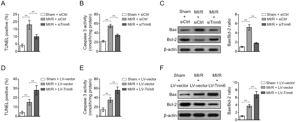 The induction of myocardial apoptosis is fundamental for MI/R injury [21]. We found that siRNA-mediated TRIM6 knockdown minimized myocardial apoptosis induced by MI/R injury, as evidenced by the decreased number of TUNEL positive cardiomyocytes (Figure 3A), reduced caspase 3 activity (Figure 3B) and expression of cleaved caspase-3 (Supplementary Figure 2A), as well as declined Bax/Bcl-2 ratio (Figure 3C). In contrast, TRIM6 overexpression in the heart of MI/R mice increased the number of TUNEL positive cardiomyocytes (Figure 3D) and elevated the caspase 3 activity (Figure 3E) and expression of cleaved caspase-3 (Supplementary Figure 2B), and Bax/Bcl-2 ratio (Figure 3F). Taken together, these findings illustrate that TRIM6 promotes myocardial apoptosis after MI/R injury, which is in accordance with its detrimental role in exacerbating MI/R injury shown in Figure 2.