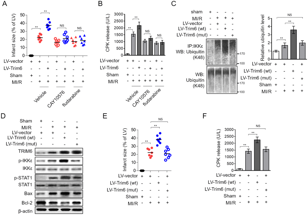 To understand the contribution of IKKε-dependent STAT1 activation to TRIM6-promoted MI/R injury, we assessed the infarct size and serum CPK level when IKKε/STAT1 axis was blocked by CAY10576 or fludarabine. We found that the treatment of both CAY10576 and fludarabine reversed TRIM6-aggravated myocardial infarct size (Figure 5A) and serum CPK level (Figure 5B), therefore illustrating that TRIM6 promotes MI/R injury by inducing IKKε/STAT1 activation-mediated myocardial apoptosis. It has been previously demonstrated that TRIM6 induces IKKε/STAT1 activation through catalyzing the modification of unanchored K48-linked polyubiquitin chains to IKKε, which requires its E3 ligase activity [19]. To gain further mechanistical insights into the role of TRIM6-mediated IKKε/STAT1 activation in MI/R injury, a C15A RING mutant TRIM6 (LV-Trim6-mut) was constructed, which lacks the E3 catalytic activity to catalyze IKKε polyubiquitin [19]. Co-immunoprecipitation (Co-IP) assay demonstrated that the K48-linked polyubiquitin bound to IKKε was increased in the heart following MI/R injury, which was further enhanced by the overexpression of wild-type Trim6 (LV-Trim6-wt) but not LV-Trim6-mut (Figure 5C), indicating that TRIM6 catalyzes IKKε ubiquitination following MI/R injury. Notably, consistent with the notion that TRIM6 activates IKKε/STAT1 through IKKε ubiquitination, we found that compared with LV-Trim6-wt overexpression, LV-Trim6-mut overexpression failed to enhance the activation of IKKε/STAT1 in the heart after MI/R injury (Figure 5D). Accordingly, Western blotting analysis of Bax and Bcl-2 showed that the promoted myocardial apoptosis after MI/R injury also vanished when overexpressed with LV-Trim6-mut (Figure 5D). Furthermore, in concert with this result, LV-Trim6-mut overexpression was unable to aggravate MI/R injury, as evidenced by the results of infarct size (Figure 5E) and CPK release (Figure 5F). Thus, these lines of evidence further consolidate the concept that TRIM6 promotes myocardial apoptosis and exacerbates MI/R injury through inducing the activation of IKKε/STAT1 axis, which requires its E3 ligase activity to catalyze K48-linked polyubiquitin of IKKε (Figure 6).
