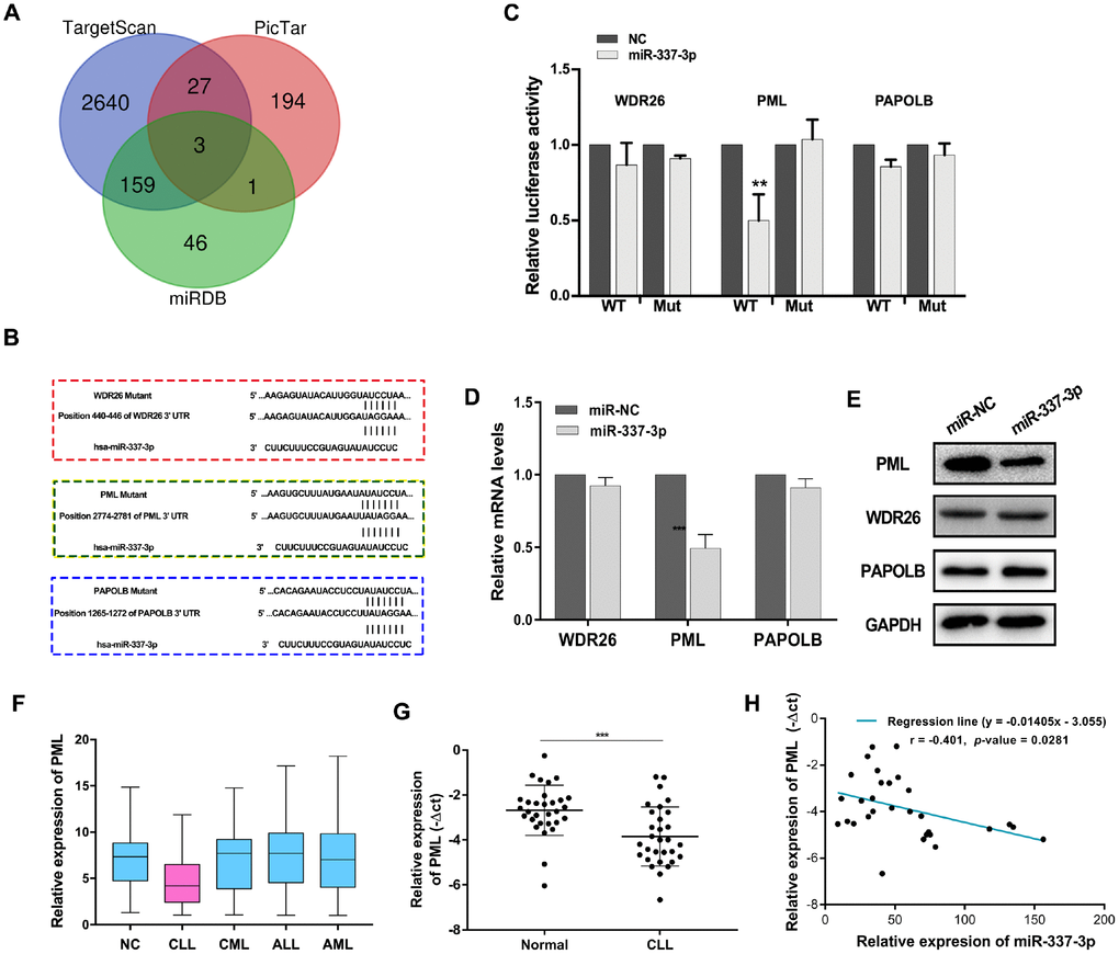 However, limitations cannot not be neglected in our research. Our future work will focus on the following explorations: Firstly, validate the expression of miR-337-3p in a larger cohort of CLL patients. Retrospective analysis is needed to be carried out by following up patients, aimed at finding out the relationship between miR-337-3p and the diagnosis, treatment and prognosis of CLL patients. Considering that our screen system might rule out circRNAs that participated in the process, the next step would be to add the whole transcriptome which will enable the full disclosure of regulatory mechanism of miR-337-3p. A body of evidence indicated that PML is a tumor suppressor and promising therapeutic targets, might be associated with chemo-resistant as well [26–28]. Nextly, gain and loss function assay of PML, a target gene presumably involved in CLL progression, will be performed to further elucidate its functions in order to provide a novel strategy to treat CLL.