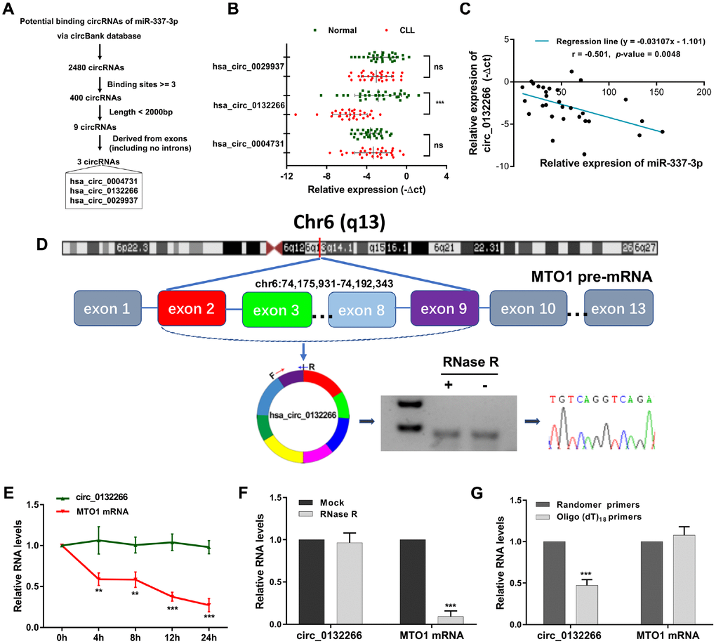 To determine the circRNA(s) responsible for the regulation of miR-337-3p, we screened circBank database (http://www.circbank.cn) through a detailed screening system and finally screened out three most promising candidates, hsa_circ_0004731, hsa_circ_0132266 (circ_0132266), hsa_circ_0029937 (Figure 3A). The abundance of the three circRNAs was then examined in CLL and normal patients. Circ_0132266 was remarkably decreased in CLL patients while the other two had no difference (Figure 3B). Meanwhile, the expression of miR-337-3p was found to be negatively associated with circ_0132266 (Figure 3C).