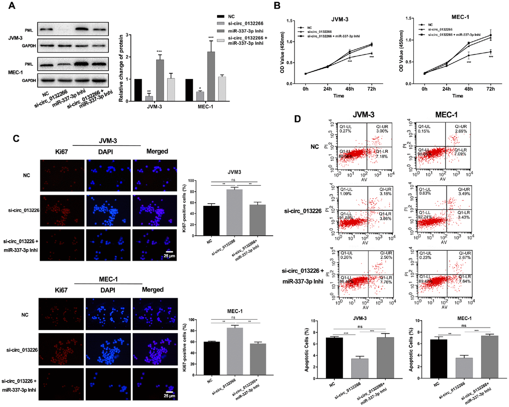 Circular RNAs (circRNAs), widely expressed in human transcriptome, have been disclosed to function as a competitive endogenous RNA (ceRNA) via sponging miRNAs and further responsible for the expression of mRNA and the occurrence and development of diseases [15, 16]. Herein, we identified a CLL-related circRNA, circ_0132266, with an obviously low expression level and was negatively associated with miR-337-3p. Our research, for the first time, uncovered the functions of circ_0132266, which could compete for miR-337-3p and further influence the expression abundance of promyelocytic leukemia protein (PML) and thus promote CLL progression. Our results may provide a novel diagnostic and therapeutic candidate for CLL.