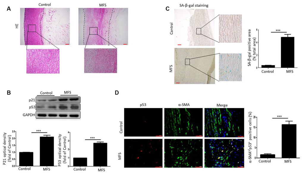We next examined cellular senescence within the aortic aneurysm of MFS patients. Western blotting revealed that levels of the cellular senescence markers p53 and p21 were significantly higher in aortic tissue from MFS patients than control donors (Figure 1B). Likewise, staining revealed that senescence-associated β-galactosidase (SA-β-gal) activity was also significantly elevated in MFS patients, and that the increased SA-β-gal positivity was mainly localized to medial VSMCs (Figure 1C). The further assess the involvement of VSMC senescence in aortic aneurysms in MFS patients, we double stained aortic tissue samples for the VSMC marker α-SMA and the cellular senescence marker p53. We found that the numbers of α-SMA+p53+ double-positive cells were markedly higher in tissues from MFS patients than control donors (Figure 1D). Collectively, these findings suggest that VSMCs are senescent in aortic aneurysmal tissue from MFS patients.