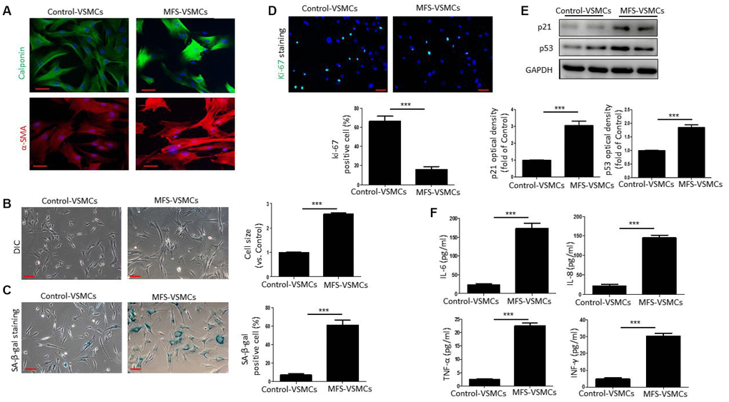 To further examine VSMC senescence in MFS patients, we first isolated VSMCs from aortic tissue from MFS patients and control donors. Both control-VSMCs and MFS-VSMCs expressed α-SMA and calponin (Figure 2A), indicating that VSMCs had been successfully isolated. As shown in Figure 2B, control-VSMCs had a healthy spindle shape, whereas MFS-VSMCs were greatly enlarged and flattened (Figure 2B). In addition, the frequency of SA-β-gal positivity was significantly higher among MFS-VSMCs than control-VSMCs (Figure 2C). By contrast, numbers of ki-67-positive cells was dramatically lower in MFS-VSMCs than control-VSMCs (Figure 2D). Levels of p53 and p21 were higher in MFS-VSMCs than control-VSMCs (Figure 2E). Because a key feature of senescent cells is the SASP, we used ELISAs to measure the levels of SASP factors in medium conditioned by MFS- and control-VSMCs. We found that MFS-VSMCs secreted higher levels of IL-6, IL-8, TNF-α and INF-γ than control-VSMCs (Figure 2F). MFS-VSMCs thus exhibit the characteristic features of cellular senescence.