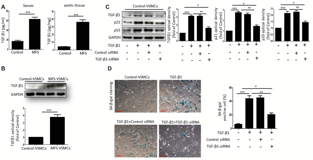 To investigate whether TGF-β1 can induce VSMC senescence, we first measured TGF-β1 concentrations in serum and aortic tissue from control donors and MFS patients. Compared with control donors, the level of TGF-β1 was markedly upregulated in both the serum and aortic tissue from MFS patients (Figure 3A). Moreover, western blotting showed that TGF-β1 levels were higher in MFS-VSMCs than control-VSMCs (Figure 3B). To determine whether TGF-β1 induces senescence of VSMCs, we treated control-VSMCs with 50 ng/ml TGF-β1 for 48 h. Subsequent Western blotting showed that TGF-β1-treated control-VSMCs exhibited elevated levels of TGF-β1, p53 and p21, and that this effect was blocked by TGF-β1 knockdown using targeted siRNA (Figure 3C). TGF-β1 treatment also upregulated SA-β-gal activity in control-VSMCs, and that effect, too, was suppressed by TGF-β1 knockdown (Figure 3D). Collectively, these data suggest that VSMC senescence is induced by TGF-β1.