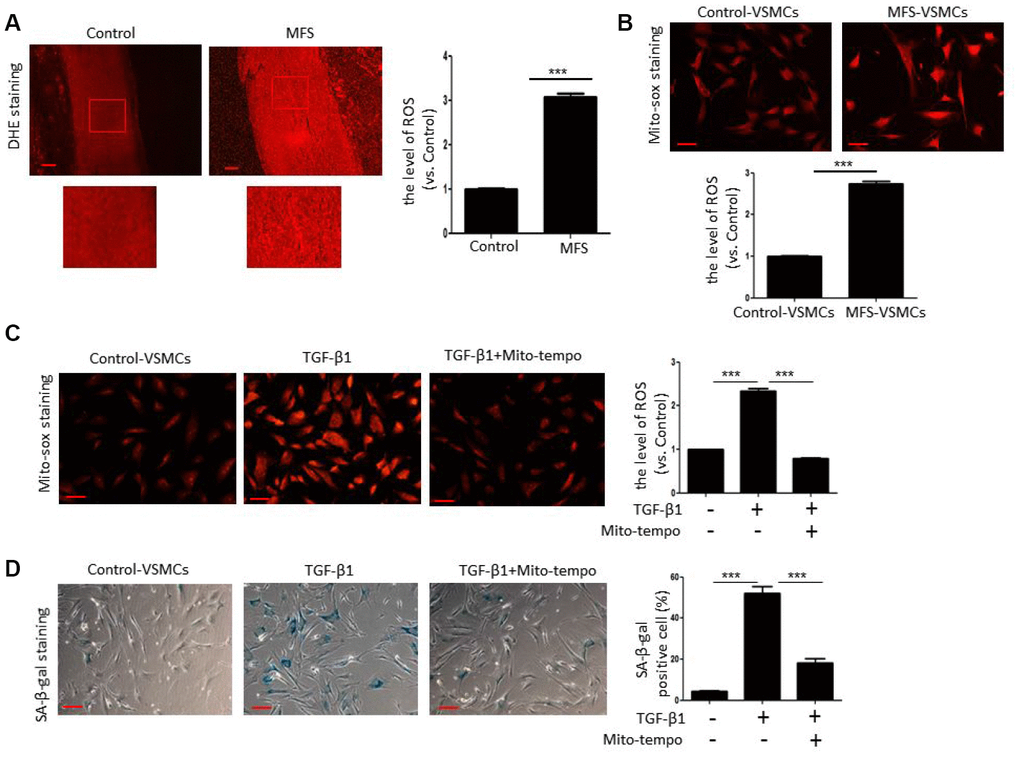 Next, we tested whether TGF-β1 induces cellular senescence of VSMCs through ROS generation. We first examined ROS generation in aortic tissue from control donors and MFS patients using DHE staining. Compared with control donors, ROS levels were significantly elevated in aortic tissue from MFS patients (Figure 4A). In addition, Mito-sox staining revealed that mitochondrial ROS levels were much higher in MFS-VSMCs than control-VSMCs (Figure 4B). We also observed that that both ROS generation (Figure 4C) and SA-β-gal activity (Figure 4D) were greatly enhanced in control-VSMC treated with TGF-β1. This suggests TGF-β1-induced ROS generation likely contributes to the development of VSMC senescence. Consistent with that idea, Mito-tempo, a mitochondria-targeted antioxidant, effectively inhibited ROS production (Figure 4C) and diminished SA-β-gal activity (Figure 4D) in TGF-β1-treated control-VSMCs. These data indicate that TGF-β1 induces VSMC senescence at least in part via ROS generation.