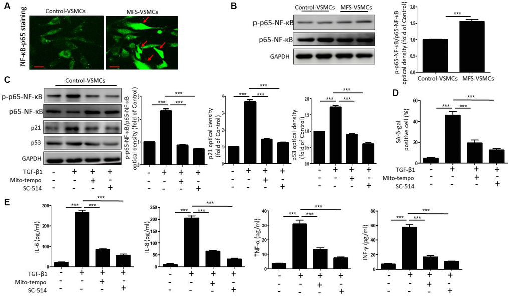 Because NF-κB is known to promote cellular senescence and SASP secretion [16], we investigated whether TGF-β1 induces VSMC senescence through ROS-mediated activation of the NF-κB signaling pathway. We first used immunofluorescent staining to examine the nuclear translocation of p65-NF-κB, an index of NF-κB activation, in control- and MFS-VSMCs. We observed that translocation of p65-NF-κB from the cytoplasm to the nucleus was greater in MFS- VSMCs than control-VSMCs (Figure 5A), indicating greater NF-kB activation in MFS-VSMCs. Levels of phosphorylated (p)p65-NF-κB were also significantly higher in MFS- than control-VSMCs (Figure 5B). In addition, TGF-β1 treatment upregulated expression of p-p65-NF-κB, p53, and p21 (Figure 5C) and enhanced SA-β-gal activity (Figure 5D) in control-VSMCs. All these effects significantly inhibited by Mito-tempo or the NF-κB inhibitor SC-154 (Figure 5C, 5D). This suggests TGF-β1 mediates NF-κB activation through ROS generation, which in turn promotes VSMC senescence. Mito-Tempo or SC-154 also inhibited the TGF-β1-induced increases in IL-6, IL-8, TNF-α and INF-γ release from control-VSMCs (Figure 5E). These results show that TGF-β1 induced the SASP via a ROS/NF-κB pathway in VSMCs.