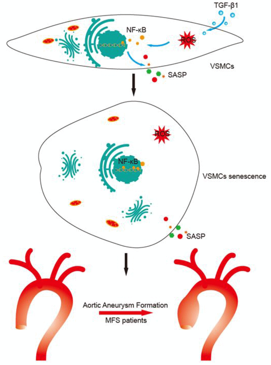 In summary, our study shows that excessive TGF-β1 can induce VSMC senescence and initiate the SASP via the ROS/NF-κB signal pathway, leading to aortic aneurysm formation in patients of MFS. This study thus provides new insight into the potential pathogenesis of aortic aneurysm and provides a novel therapeutic target for MFS treatment.