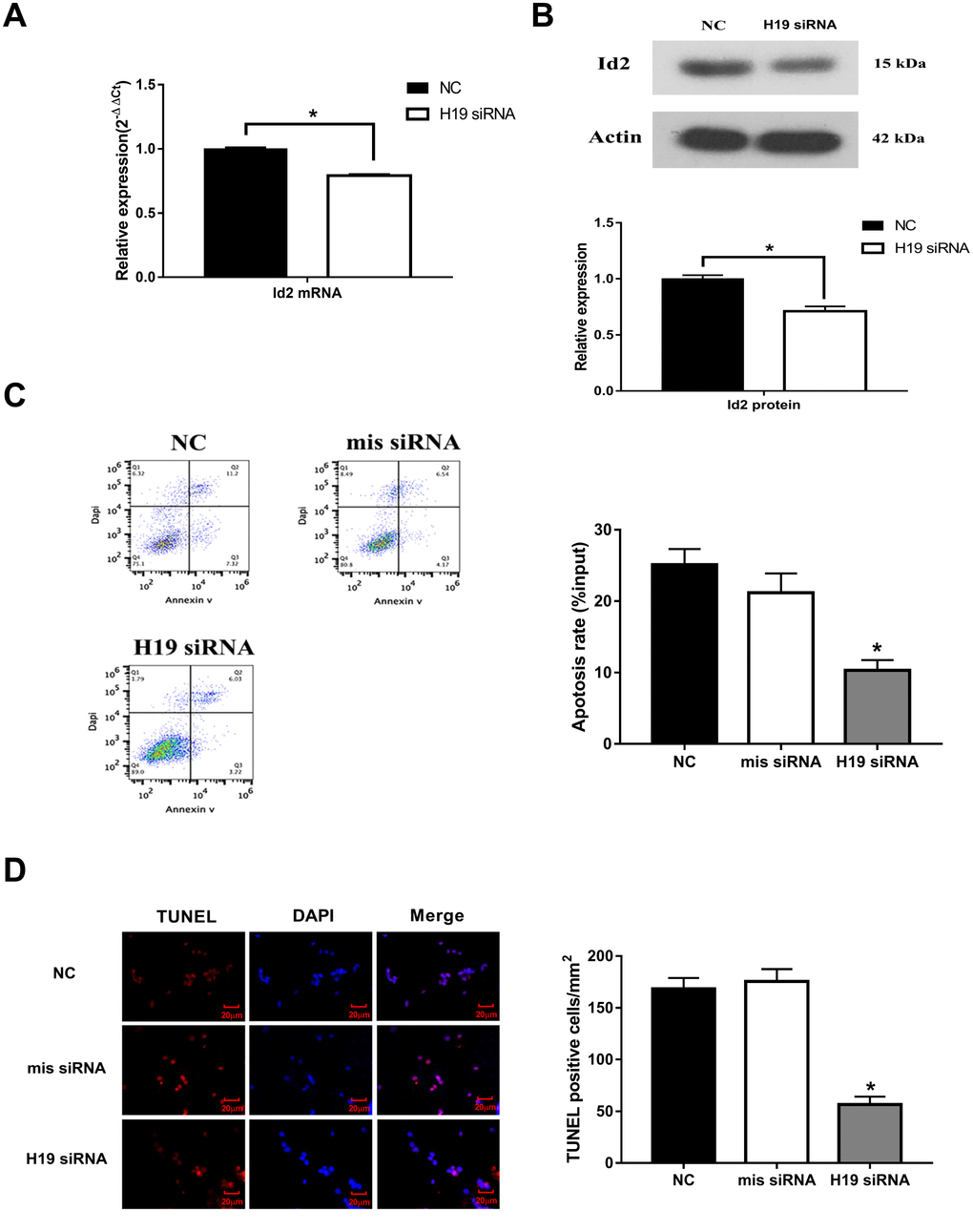 To further investigate the effect of H19 on Id2, three different siRNAs were designed against H19 (named as siRNA-1, siRNA-2, and siRNA-3). All three siRNAs were effective in knocking down H19 expression (p<0.05, respectively), however, siRNA-1 demonstrated the best efficiency and was therefore utilized in subsequent knockdown experiments (Supplementary Figure 1). With knockdown of H19, Id2 mRNA (Figure 2A) and protein (Figure 2B) levels were significantly decreased (p<0.05, respectively). Additionally, flow cytometric analysis and immunofluorescence staining demonstrated a significant decrease in the rate of neuronal apoptosis in the H19 siRNA group, compared with the NC group or mis siRNA group (Figure 2C and 2D; p<0.01, respectively).