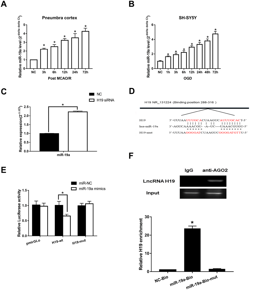 To assess if H19 directly interacted with miR-19a, we first determined the levels of miR-19a in the setting of H/I. qRT-PCR analysis revealed that miR-19a levels increased significantly within the first 72 h after H/I in both MCAO/R and OGD models (p<0.05, respectively) (Figure 4A and 4B). Next, we assessed how miR-19a level varied with knockdown of H19 by siRNA. In the setting of H19 knockdown, miR-19a levels were significantly elevated in OGD neuronal cells (Figure 4C, p<0.05), suggesting H19 decreased miR-19a level after H/I.