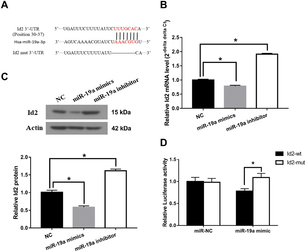 We subsequently investigated the interaction between miR-19a and Id2 mRNA. We used miRanda software (http://www.microrna.org/microrna/home.do) to find miR-19a that could potentially bind to 3′-UTR of Id2 mRNA. The predicted fragment including binding sites were cloned into the wild-type (Id2-wt) and mutated fragment (Id2-mut) (Figure 5A). When treated with miR-19a mimic, the expressions of Id2 mRNA and protein in OGD neuronal cells were inhibited. In contrast, when treated with miR-19a inhibitor, Id2 mRNA and protein expressions increased (Figure 5B and 5C; p<0.05, respectively). Furthermore, dual-luciferase report assay demonstrated that miR-19a mimic reduced the luciferase activity of Id2-wt, but not of Id2-mut (Figure 5D; p<0.05). These results suggested Id2 mRNA is a direct target of miR-19a, which exerted a direct inhibitory effect on Id2 expression via binding 3′-UTR of Id2 mRNA.