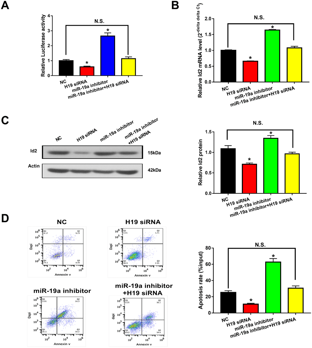 Given the aforementioned results, we hypothesized that the H19-miR-19a-Id2 axis modulated hypoxia induced neuronal apoptosis. To test this hypothesis, luciferase reporter plasmids containing the 3′-UTR of Id2 were constructed. As expected, knockdown of H19 decreased luciferase activity in HEK293T cells transfected with Luc-Id2-3′-UTR (Figure 6A; p<0.05); conversely, luciferase activity was rescued with the introduction of miR-19a inhibitor (Figure 6A; p>0.05). Furthermore, in OGD neuronal cells, knockdown of H19 decreased the expression of Id2 mRNA and protein (Figure 6B and 6C; p<0.05); while this inhibition was attenuated by co-transfection of miR-19a inhibitor (Figure 6B and 6C; p>0.05). Lastly, flow cytometric analysis revealed that knockdown of H19 decreased cell apoptosis in OGD neuronal cells (Figure 6D; p<0.05); however, this decrease was relieved by co-transfection of miR-19a inhibitor (Figure 6D; p>0.05). Taken together, these results demonstrated that H19-miR-19a-Id2 axis modulated hypoxia induced neuronal apoptosis, and blocking H19-miR-19a-Id2 axis could alleviate H/I induced neuronal injury.