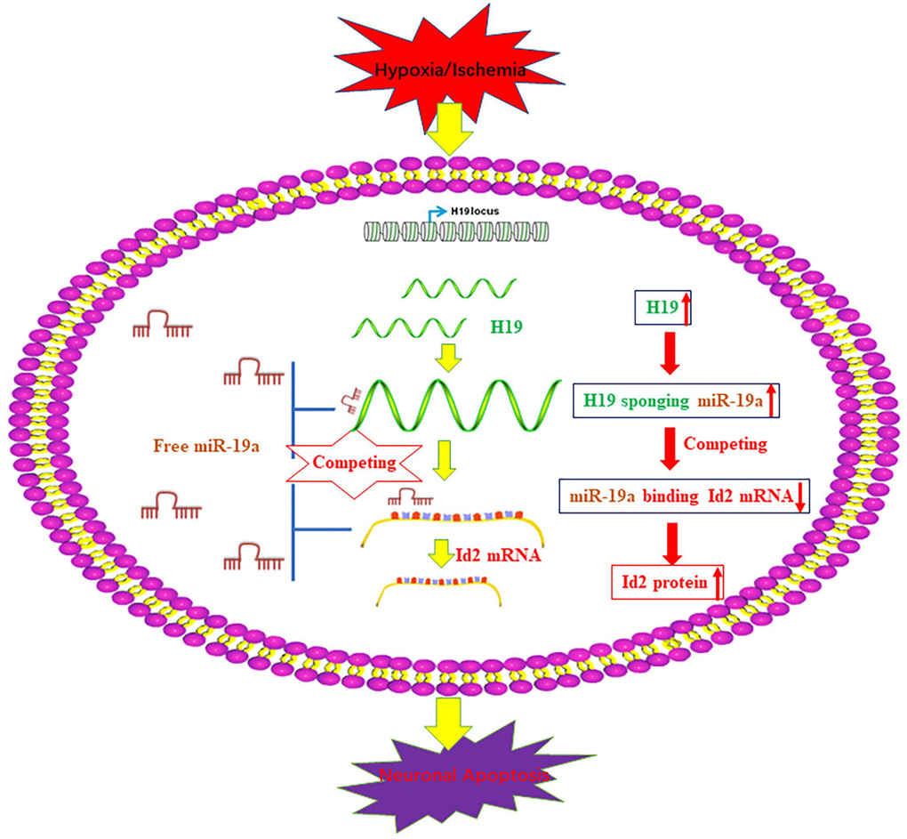 Interestingly, the elevated H19 level demonstrated a similar trend as Id2 expression after the exposure of H/I in our in-vivo and in-vitro studies. Although a similar relationship between H19 and Id2 has been indicated previously in bladder cancer cells and acute myelocytic leukemia cells, the underlying mechanistic relationship between them have not been well investigated [17, 18]. Inspired by the newly reported regulatory mechanism that H19 functioned as a competing endogenous RNA (ceRNA) via sponging miRNA [19–21, 28–30], we employed bioinformatics analysis to predict that H19 promoted Id2 expression via acting as a ceRNA by sponging miR-19a. With dual luciferase reported assay, RIP and pull-down experiments, we demonstrated the dual competitive interaction of miR-19a with H19 and the 3′-UTR of Id2 mRNA. For the first time, we identified the axis of H19-miR-19a-Id2 in the process of H/I induced neuronal apoptosis, and provide a schematic figure outlining the mechanistic relationships of H19-miR-19a-Id2 axis (Figure 7). Lastly, we demonstrated that H19-miR-19a-Id2 axis modulates H/I-induced neuronal apoptosis and blockage of the axis may have therapeutic benefit in the treatment of ischemic brain injury.