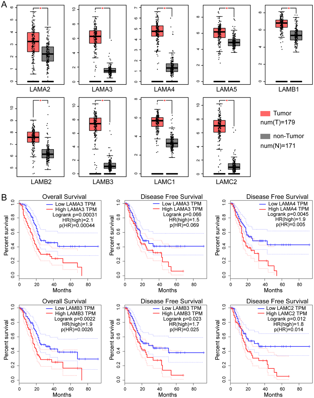 The differential expression of genes of laminin family in The Cancer Genome Atlas (TCGA) pancreatic adenocarcinoma (PAAD) cohort tumor and non-tumor tissues analyzed by Gene Expression Profiling Interactive Analysis (GEPIA, http://gepia.cancer-pku.cn/). All parameters were set to default values and patients were divided into two groups based on median expression. The results show that 9 laminin subunit genes (LAMA2, LAMA3, LAMA4, LAMA5, LAMB1, LAMB2, LAMB3, LAMC1, LAMC2) were highly expressed in tumor tissues of PAAD, with differences that were statistically significant (Figure 1A). In the survival analysis, high LAMA3 and LAMB3 expression groups were found to be related to adverse OS outcome in the PAAD cohort (log-rank p=0.0031 and 0.0022, respectively; Figure 1B). Additionally, high LAMA4, LAMB3 and LAMC2 expression groups were found to have a higher risk with regard to DFS in PAAD patients (HR=1.9, 1.7 and 1.8, respectively; Figure 1B).