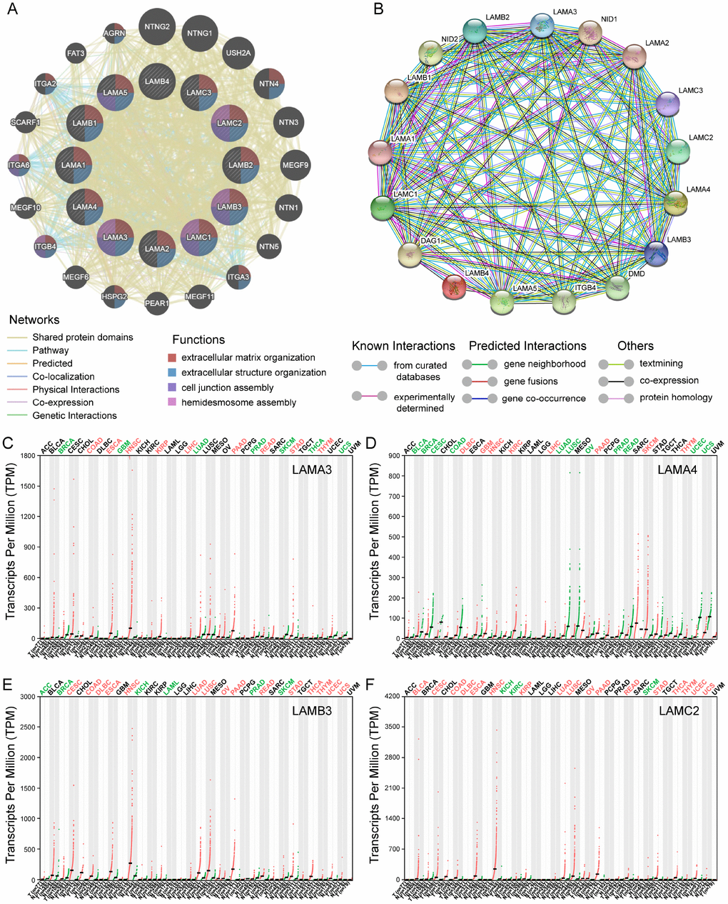 The KEGG pathway and GO term analyses were performed using the Clusterprofiler R package (Supplementary Figure 1). The results demonstrated that products encoded by the genes of laminin family may be involved in the formation of extracellular matrices and are associated with cellular focal adhesion. Furthermore, genes of this family are involved in the PI3K-Akt signaling pathway and were found to partially bind to integrin subunits (ITG) in the enrichment analysis (Supplementary Figure 1). The gene-gene interaction network generated using GeneMANIA showed that genes in the laminin family may be associated with ITG and genes of netrin family (Figure 2A). In the protein-protein interaction network analysis conducted using the Search Tool for the Retrieval of Interacting Genes/Proteins (STRING), the laminin proteins were found to have a co-expression relationship with ITG and nidogen proteins (Figure 2B).