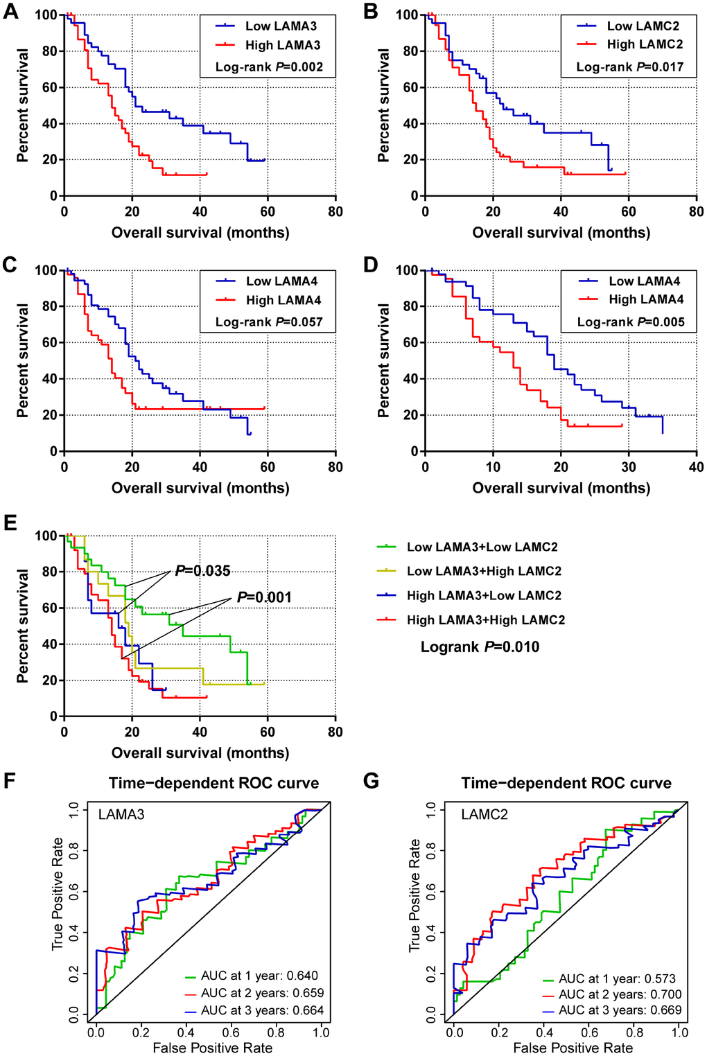 For the laminin subunits (LAMA3, LAMA4, LAMB3 and LAMC2) that were found to be associated with the prognosis of pancreatic cancer, we further analyzed their TCGA tumor tissue expression profiles (Figure 2C–2F). The results show that the expression of these genes may be upregulated in some of digestive tract tumors. Using the GSE21501 PDAC cohort, we further studied the relationship between the expression of genes of laminin family and prognosis of PDAC patients. Setting the median as the cutoff value, the Kaplan–Meier survival curves indicated that LAMA3 and LAMC2 expression are associated with the OS of PDAC patients (log-rank p=0.002 and 0.017, respectively; Figure 3A–3B). Although the survival analysis showed that LAMA4 gene expression and OS of PDAC did not reach statistical significance, it was also found to be associated with the 3-year OS of PDAC (Figure 3C–3D). However, no statistically significance was found in the association between LAMB3 expression and the OS of PDAC patients (Supplementary Table 1). The combined survival analysis demonstrated that the combination of high LAMA3 expression along with high or low expression of LAMC2 can have an adverse effect on the OS of PDAC patients (Figure 3E, Supplementary Table 2). The area under the curve (AUC) of the time-dependent receiver operating characteristic (ROC) curve for LAMA3 and LAMC2 indicating 1-, 2- and 3-year OS fluctuated between 0.6 and 0.7 (Figure 3F–3G).