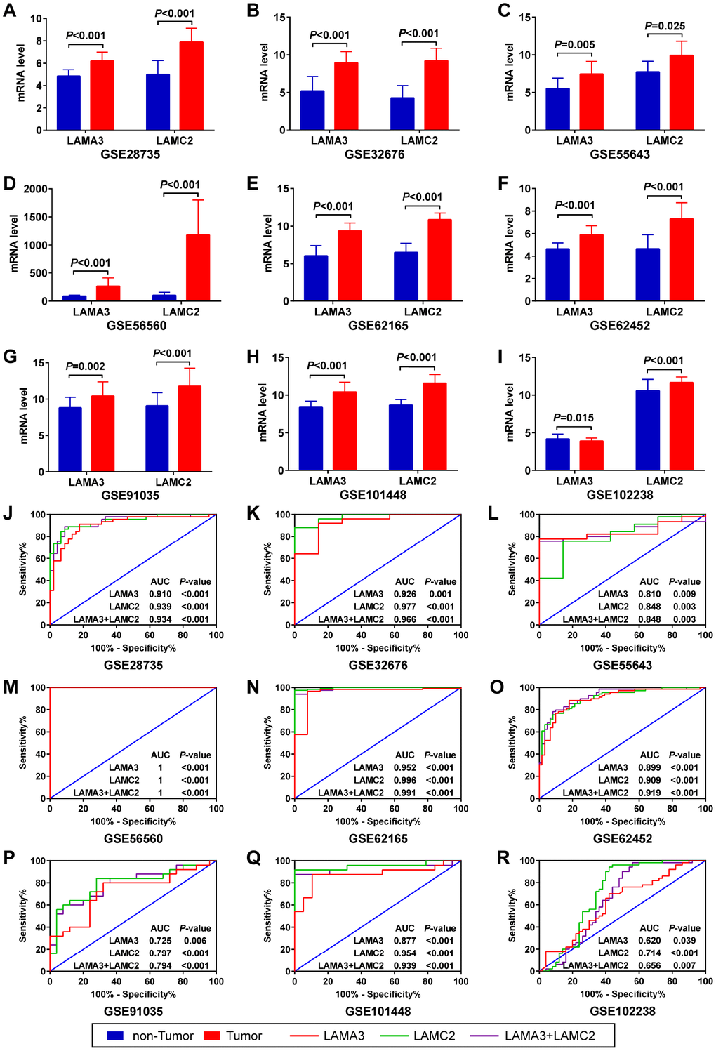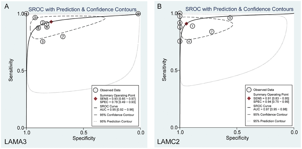 After filtering using the previous steps, we explored the expression of LAMA3 and LAMC2 in Genotype-Tissue Expression (GTEx) normal tissues and found that the expression of LAMA3 and LAMC2 were downregulated in pancreas tissues (Supplementary Figure 2). Using a selection process to identify tumor histology diagnosis of PDAC sets in GEO, 9 sets were included in this study (Supplementary Table 3). The results show that LAMA3 and LAMC2 expression is significantly upregulated in PDAC tumor tissues in most studies (Figure 4A–4I). The expression of LAMA3, LAMA4, LAMB3 and LAMC2 in each sample of the 9 sets, and the expression of all laminin genes in GTEx normal tissues are shown in the heatmap (Supplementary Figure 3 and Figure 4A, respectively). The ROC analysis of LAMA3, LAMC2 and their combined expression in PDAC sets indicate that both genes display high accuracy in distinguishing between tumor and non-tumor tissues (the AUCs of the ROC curves were >0.70, Figure 4J–4R). The summary receiver operating characteristic (SROC) curves indicate that the AUCs of LAMA3 and LAMC2 are more than 0.90 in PDAC patients (Figure 5).