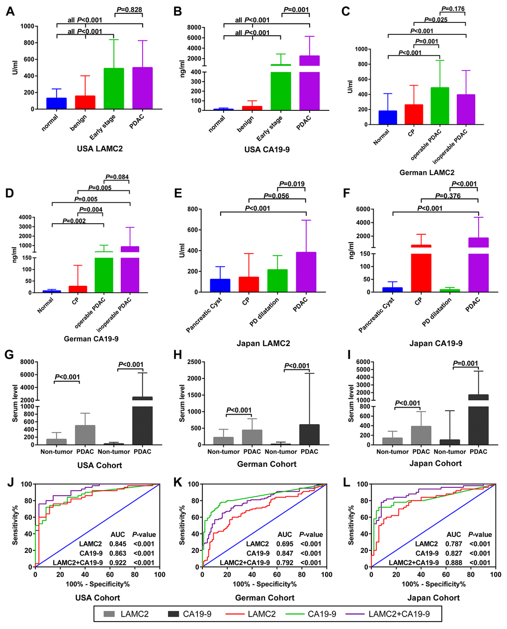 Serum levels of LAMC2 and CA19-9 in PDAC patients