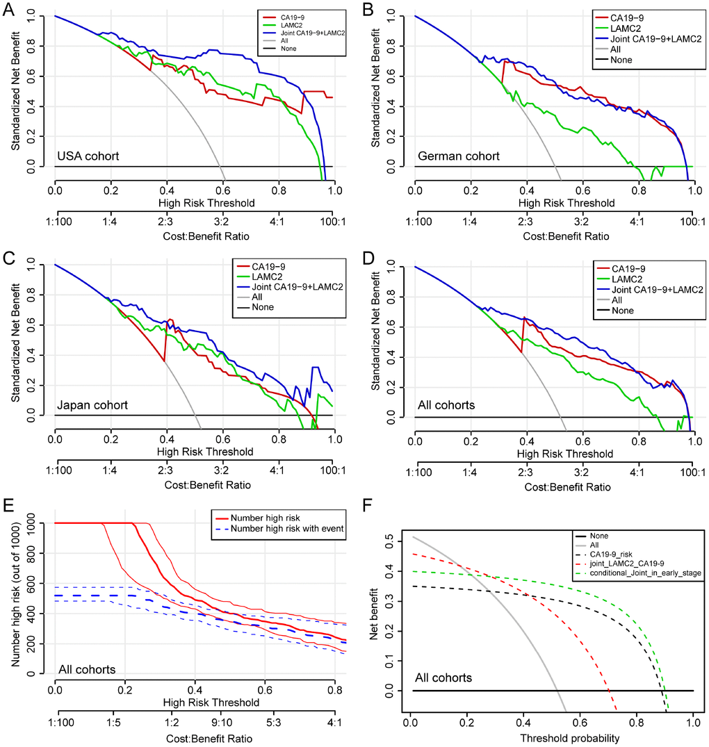 Compared with normal or benign pancreatic tissues, the serum levels of LAMC2 and CA19-9 have been found to be elevated in PDAC patients from USA, German and Japan cohorts, with different groups reaching varied levels of statistical significance (p<0.05, Figure 6A–6F). Results of the combined analysis suggest that serum level of LAMC2 and CA19-9 were higher in the PDAC patients than that of non-tumor patients/heathy donor from USA, German and Japan cohorts (p<0.05, Figure 6G–6I, Supplementary Table 3). Furthermore, serum LAMC2 levels can be used to significantly improve the diagnostic accuracy of using CA19-9 for PDAC patients, since the AUC for distinguishing between tumor and non-tumor tissues for the combined analysis of LAMC2 and CA19-9 (AUC=0.922, 0.792 and 0.888, respectively) in two of three cohorts were higher than the AUC values obtained for CA19-9 alone (AUC=0.863, 0.847 and 0.827, respectively; Figure 6J–6L). In the decision curve analysis, we found that the proportion of standardized net benefit populations increase rapidly for serum CA19-9 when the threshold probability is between 0.3-0.4 (Figure 7A–7D). Net benefit populations improved in the joint LAMC2 and CA19-9 analysis at a low threshold probability, indicating that there is diagnostic complementarity between LAMC2 and CA19-9 (cost and benefit ratio is significantly reduced) (Figure 7A–7D). The standardized net benefit proportion of every 1000 resamples had a threshold probability of less than 0.3 and was higher than other thresholds (Figure 7E). Moreover, joint use for the diagnosis of significantly increased the percentage of the early stage/operable PDAC benefiting population, suggesting that the clinician can diagnose PDAC in the patient group earlier (Figure 7F).