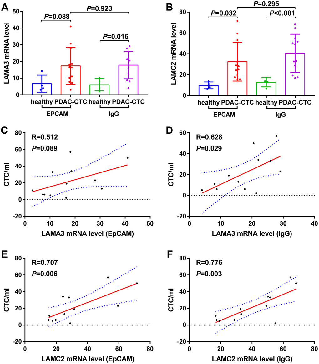 The expression of LAMA3 and LAMC2 in PDAC CTC were higher than that of healthy donor whole blood cells when the analysis was performed using GSE40171 expression profiling (Figure 8A–8B). Furthermore, the correlation analysis indicates that high LAMA3 expression is positively related with the number of CTC in the blood using IgG chips (R=0.628, p=0.029, Figure 8D) but not using EpCAM chips (R=0.512, p=0.089, Figure 8C). However, high LAMC2 expression was found to be statistically positively related with the number of CTC in the blood using both EpCAM (R=0.707, p=0.006, Figure 8E) and IgG chips (R=0.776, p=0.003, Figure 8F). Expression of LAMA3 and LAMC2 were found to be at low levels in whole blood cells of the GTEx heathy cohort (Supplementary Figure 2). There was no statistical difference between the expression of LAMA3 and LAMC2 from PDAC patients in peripheral mononuclear cells and whole blood cells compared with that of heathy controls (Supplementary Figure 4B–4C).