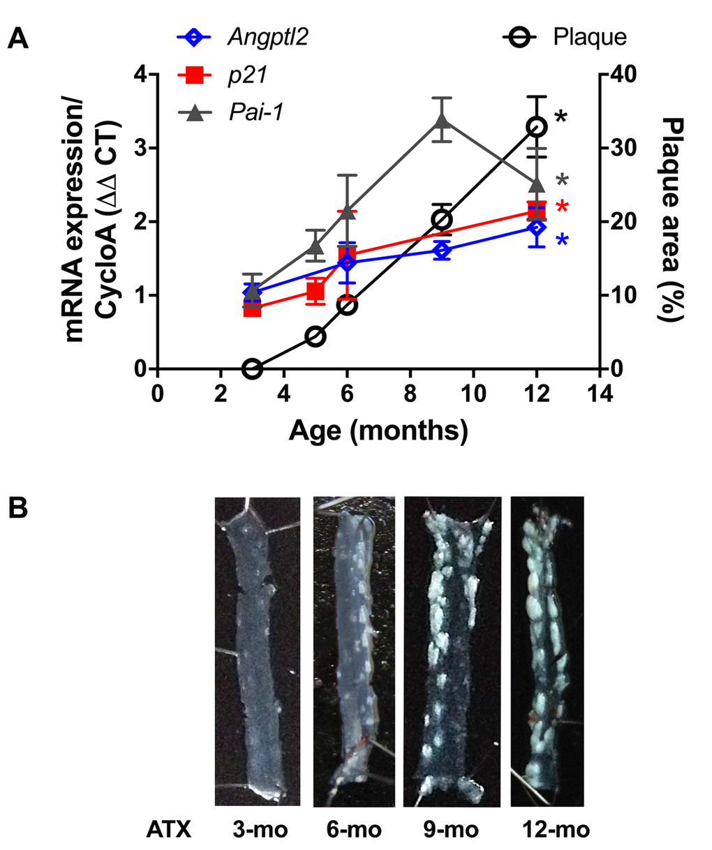 Firstly, and as expected, endothelial expression of angptl2, Pai-1 and p21 parallels the growing atheroma plaque in untreated LDLr-/-;hApoB100+/+ atherosclerotic (ATX) mice up to 12-month old (-mo) (Figure 1); p21 is a cyclin-dependent kinase inhibitor overexpressed in growth-arrested senescent cells, and Pai-1 is a recognized SASP member and inducer of senescence [15]. When compared to age-matched wild-type mice, angptl2, Pai-1 and p21 are over-expressed in the native endothelium of 6-mo ATX mice (Figure 2).