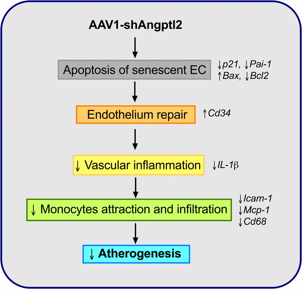 In conclusion, therapeutic down-regulation of vascular angptl2 leads to the clearance of senescent EC by apoptosis, stimulates endothelial repair, preserves endothelial functions and reduces atherosclerosis. ANGPTL2 and p21 expression are tightly associated in non-atherosclerotic human arteries, which further suggests that accumulation of arterial senescence precedes age-related atherosclerosis. Altogether, these data suggest that targeting vascular angptl2 could be a selective and safe senolytic strategy to delay or reduce atherogenesis.