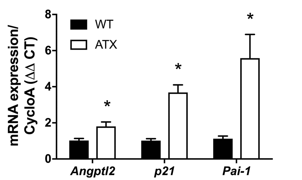 Limitations of the study: first, almost all data were provided on mRNA level. Unfortunately, there was not enough material in the native endothelium layer scraped from the mouse aorta to look at the protein level. Second, n number is relatively small and variable due to the limited and variable availability of endothelial mRNA extractions. Third, expression of p21 mRNA was unaffected by the shAngptl2 in the media, suggesting either that cells in the media were not senescent, as we propose in these young ATX mice, or, alternatively, that angptl2 is not central to the maintenance of senescence in cells other than endothelial cells. Finally, the underlying mechanism of elevated CD34+ progenitor cell recruitment after shAngptl2 treatment was not elucidated. Because on one hand, angptl2 is anti-apoptotic [56], and because on the other hand, the shAngptl2 induced apoptosis of endothelial cells, it is possible that the generation of apoptotic bodies act as chemoattractant for EpC [57,58]. This attractive hypothesis would need to be validated in specific experiments.