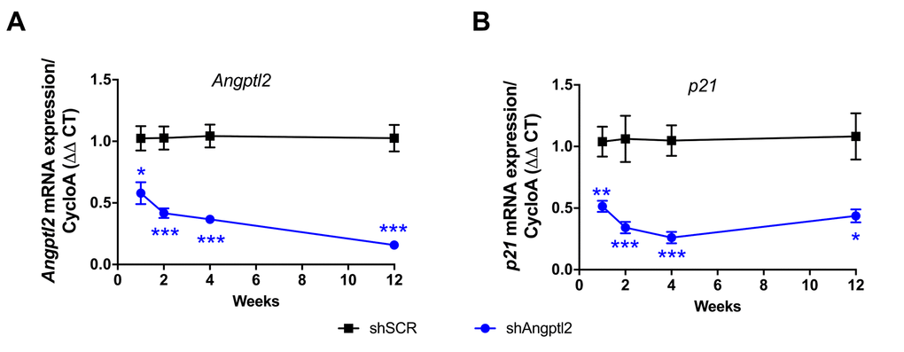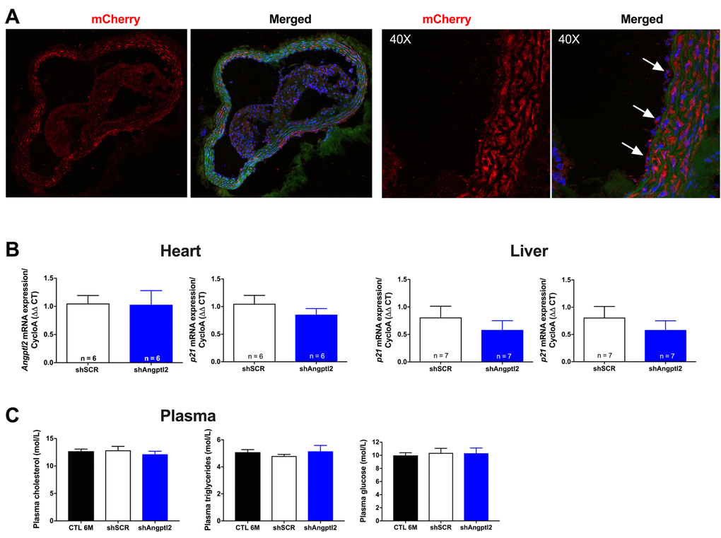 Titration was performed by qPCR reactions using a StepOnePlus Real-Time PCR System (Thermo Fisher Scientific). AAV1 were quantified using a standard range made by serial dilutions (10 ng to 10-6 ng) of shAngptl2 and shSCR plasmids containing a target sequence (BGH) or the plasmid containing mCherry sequence. The primers for BGH target sequence and mCherry were designed using Clone Manager software (Table S3). Each mouse received a systemic (i.v.) bolus injection of 1011 AAV1 particles at 3-month old (-mo) and were studied at 6-mo; some mice received an injection at 5-mo and were studied after 1 week, 2 weeks or 4 weeks. A pilot study showed that injection of 5x1010 AAV1 particles was sub-optimal, leading to an inconsistent reduction in angptl2 by ∼50% (data not shown).