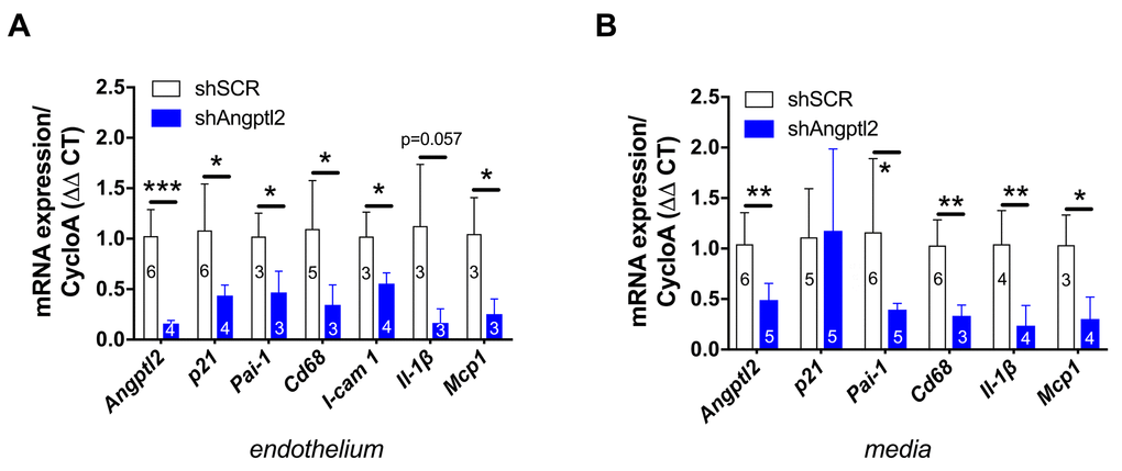 Total RNA was reverse transcribed into first-strand complementary DNA with M-MLV reverse transcriptase (Thermo Fisher), using random hexamer primers. The qPCR reactions were carried out on diluted RT products by using the DNA-binding dye SYBR Green PCR Master Mix (Thermo Fisher Scientific) to detect PCR products with StepOnePlus Real-Time PCR System (Thermo Fisher Scientific). The primers of target genes (Angptl2, p21, Il-1β, Icam-1, Cd68, Cd34, Mcp1, Bax, Bcl2) were designed using Clone Manager software (Table S3 (mouse) and S4 (human)). All samples were run in duplicate and the fold changes in gene expression were calculated by a ΔΔCT method using cycloA (cyclophilin A) as the housekeeping gene. N numbers are not homogeneous due to the limited and variable availability of endothelial mRNA extraction.