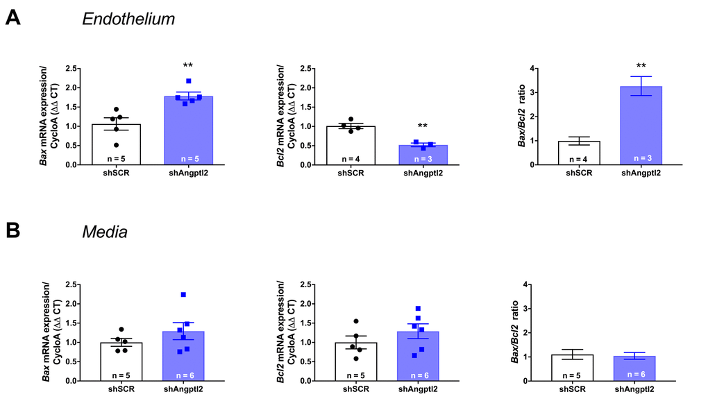 To determine the mechanism of senescent EC clearance and endothelial repair associated with the anti-atherogenic effect of the shAngptl2, we euthanized ATX mice 1, 2 and 4 weeks after AAV1-shAngptl2 infection. Concomitantly with the fast reduction in senescence (Figure 5), after only one week post-infection, endothelial pro-apoptotic Bax expression was significantly increased (p=0.005), while that of the anti-apoptotic Bcl2 was significantly decreased (p=0.003), increasing the Bax/Bcl2 ratio (Figure 7A), suggesting that angptl2+ senescent EC were eliminated, at least partly, following activation of this apoptotic pathway. In contrast, in the media neither Bax nor Bcl2 expression changed one week post-infection (Figure 7B), and this absence of apoptosis paralleled the lack of reduction in the senescence marker p21 in the media (Figure 6). Thus, AAV1-shAngptl2 infection promotes cell death of senescent angptl2+ endothelial cells by apoptosis; in contrast, in other cells from the aortic wall, shAngptl2 does not affect senescence and does not induce apoptosis.